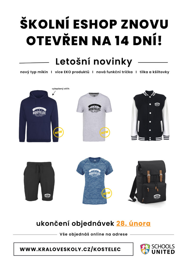 Znovu otevíráme eshop se školní kolekcí oblečení. Objednávání je již spuštěno a bude možné až do 28. 2. Následně se eshop uzavře a objednané zboží půjde do výroby. Objednávejte na adrese https://www.kraloveskoly.cz/kostelec/