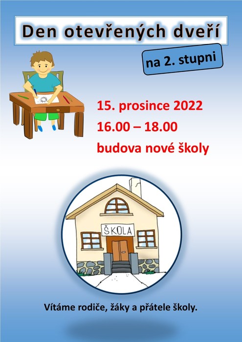 Den otevřených dveří se bude konat v budově 2. stupně 15. prosince 2022 od 16.00 do 18.00. Další podrobnosti připravujeme.