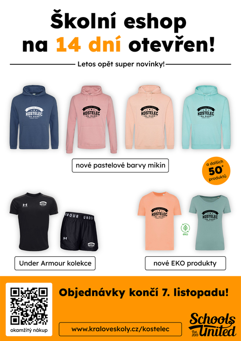 Objednávání je již spuštěno a bude možné až do 7.11.2023 Následně se eshop uzavře a objednané zboží půjde do výroby. Neváhejte proto, pokud si chcete pořídit ten svůj kousek ze školní kolekce.