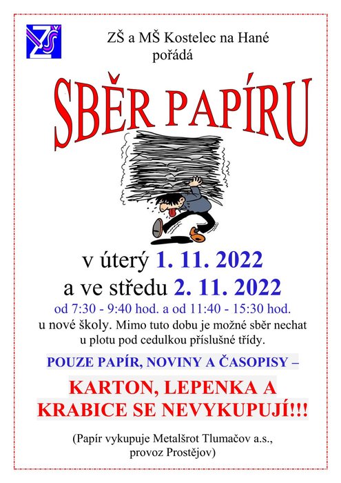 Sběr papíru proběhne v úterý 1. listopadu a ve středu 2. listopadu vždy od 7.30 - 9.40 a 11.40 - 15.30 u nové školy (zadní vjezd do jídelny). Vzhledem k současným podmínkám výkupu bereme pouze časopisy, noviny a papír. Děkujeme za podporu.